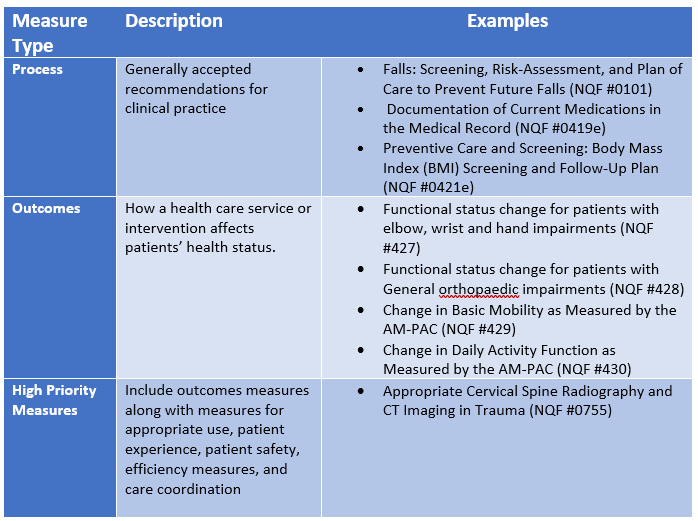 Based on the above, it is obvious that scoring well with Quality Measures is critical to success for PTs and OTs. Unlike the old PQRS program, Quality Measures have variable values. Quality Measure types that are approved by the National Quality Forum (NQF) are utilized in claims and traditional registry reporting. The measure types are illustrated below: