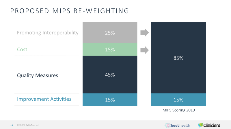 Physicians and some nurse specialists have been eligible to participate in MIPS since 2017. For those specialties, MIPS scoring for 2019 is based on four weighted categories: Promoting Interoperability, Cost, Quality Measures, and Improvement Activities.